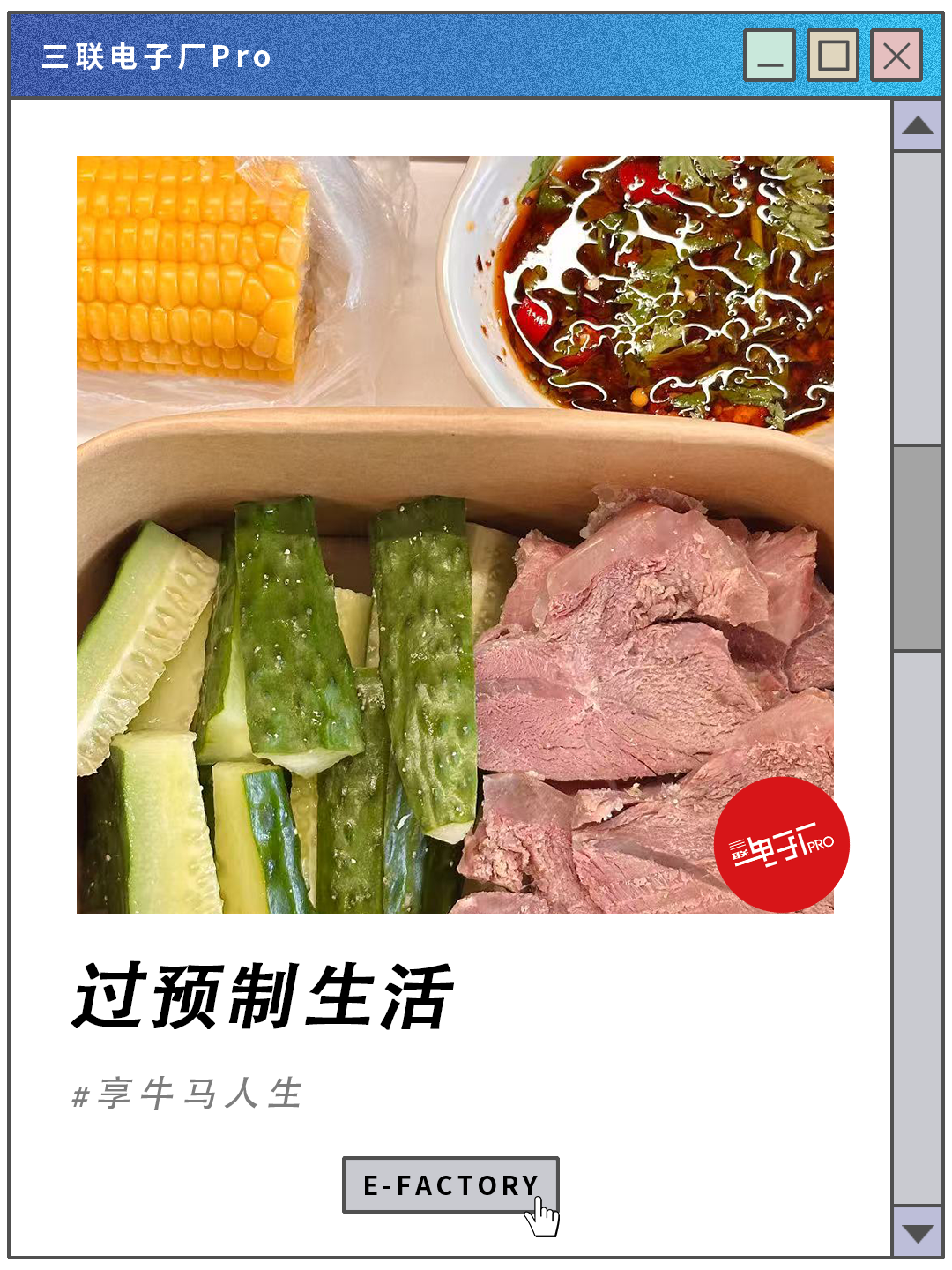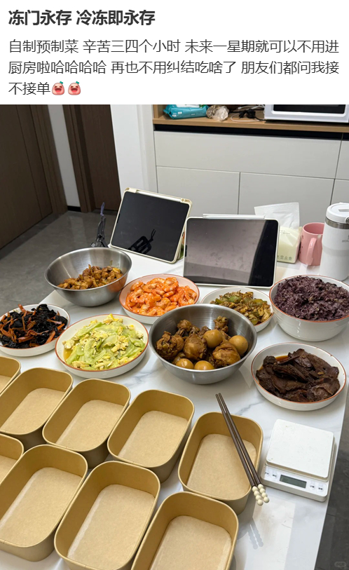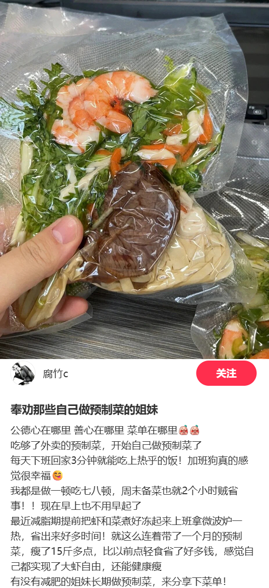 “来口新鲜的”,那盘菜的鲜香,像是把一周的疲惫都拎出了身体。毕竟,哪怕自己做的预制菜再健康,谁都受不了接下去的一周每天要吃同样的食物。