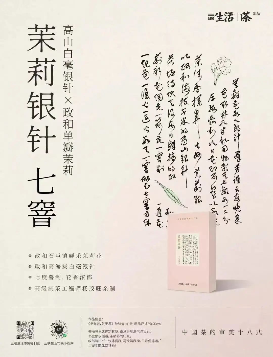 今年是三联生活市集做茉莉花茶的第十年,我们如期回到政和制作延续往年风味、市面上少见的「茉莉银针」——以政和海拔千米的茶山采摘制作的高山银针为茶坯,每一次窨制都使用当天鲜摘新花,花香尽数凸现。并特邀福建省高级制茶工程师、福建政和白茶先驱人物杨茂旺老师亲制,伺花—筛花—窨制—通花—起花—复火—退火,数天一个窨次,仅窨制就要耗费几周时间,做足每一个步骤,我们的茉莉银针才得以上线。