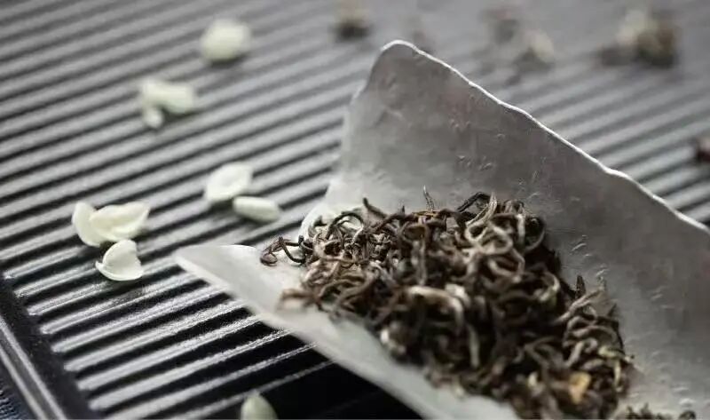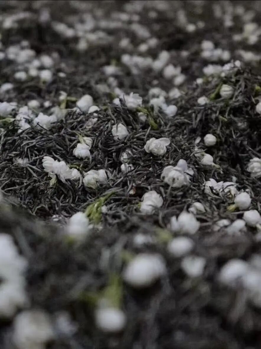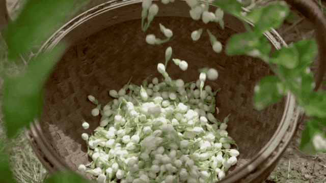再来说说这个极为关键的“窨制”。其原理是利用茶叶的吸附性及茉莉一绽就会大量释放香气的特点,将花、茶放置在一起,以使得茶叶中吸附茉莉香。操作上可见的便是采摘将开未开的茉莉,待花将将开,一层花、一层茶,层层堆叠,控制温度与湿度,花吐香,茶吸香。
