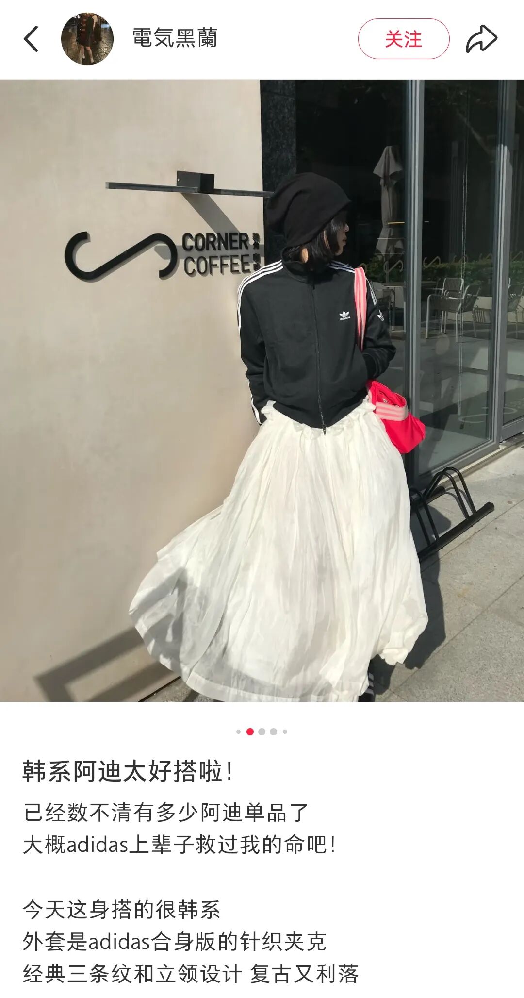 对当代年轻人来说,最重要的已不再是logo,而是态度。而三条纹似乎也因此正在成为年轻人心中的潮流代表。小红书上,# 三条纹穿搭 # 的浏览量破亿;抖音上,“三叶草OOTD”“安福路街拍”“复古松弛感穿搭”几乎是各类话题下出镜率最高的关键词。形形色色的笔记展示了不同穿搭风格:有人搭配古着丹宁,有人混搭新中式元素。在年轻人的眼中:“好像哪里都有三条纹,但每个人穿着的感觉似乎又都不大一样。”这也从另一个维度解读了当下的潮流趋势——“统一符号下的多元表达”。