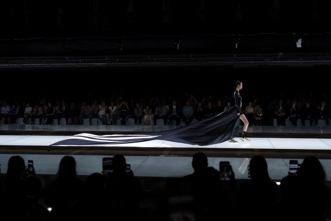 压轴篇章UNDENIABLY ADIDAS以“光”为主题。舞台中央,一道巨大投影浮现三条纹,却在镜像中不断裂变——它被切割、旋转、重组,最终化作无数条流动的光带,象征着多元与无限。超模贺聪身着五米长三条纹长裙搭配FUTURECOOL X鞋款压轴登场,极具张力的造型定格了整场大秀的未来感氛围。