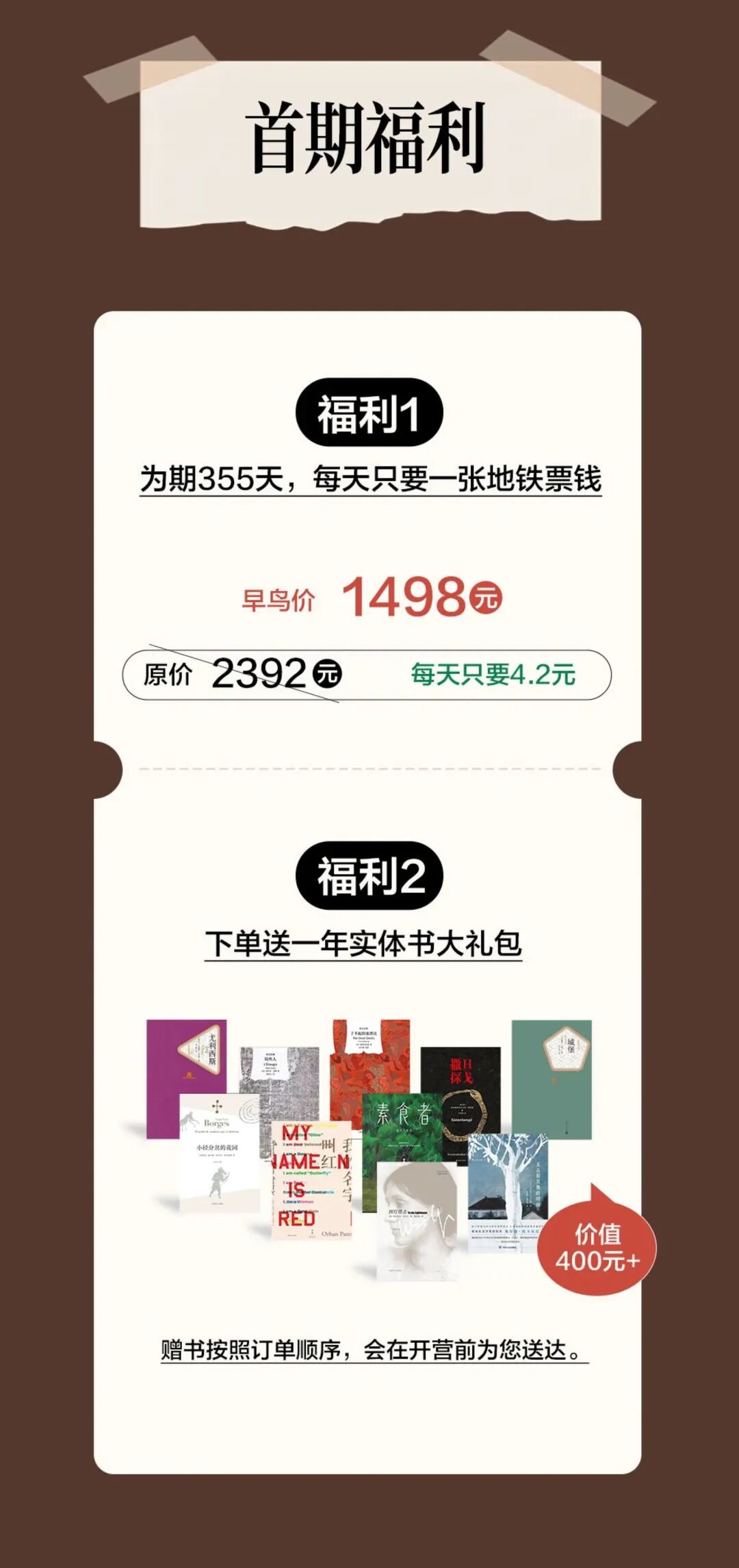 目前限时开放早鸟价1498元 / 365天(原价:2392元),每天只需4.1元,相当于一张地铁票钱,即可获得一整年的阅读陪伴与深度成长。