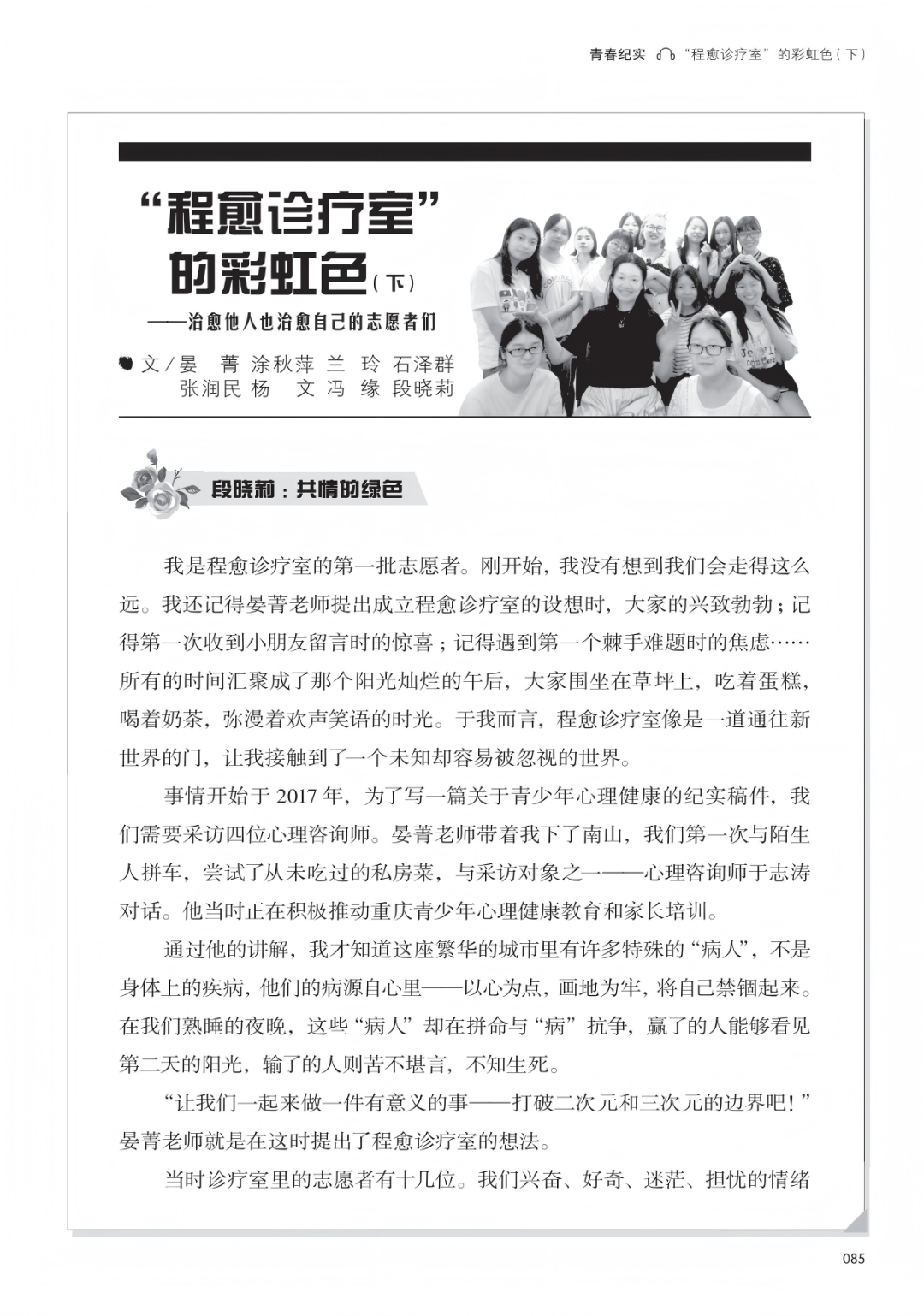 (根据志愿者们的经历完成的报告文学《“程愈诊疗室”的彩虹色》在权威少儿刊物上发表)