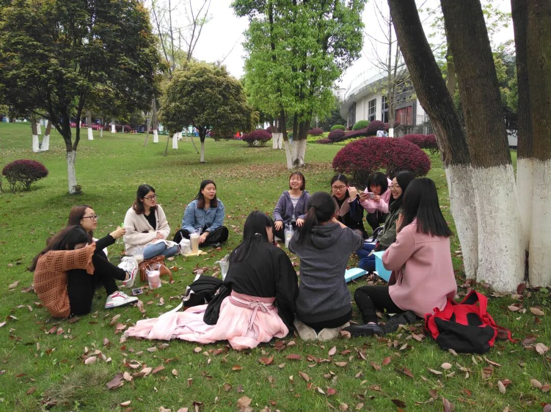 2018年春天,晏菁和工作室的同学们在处理了含有心理危机救援的信息后,在草地上展开团队辅导)