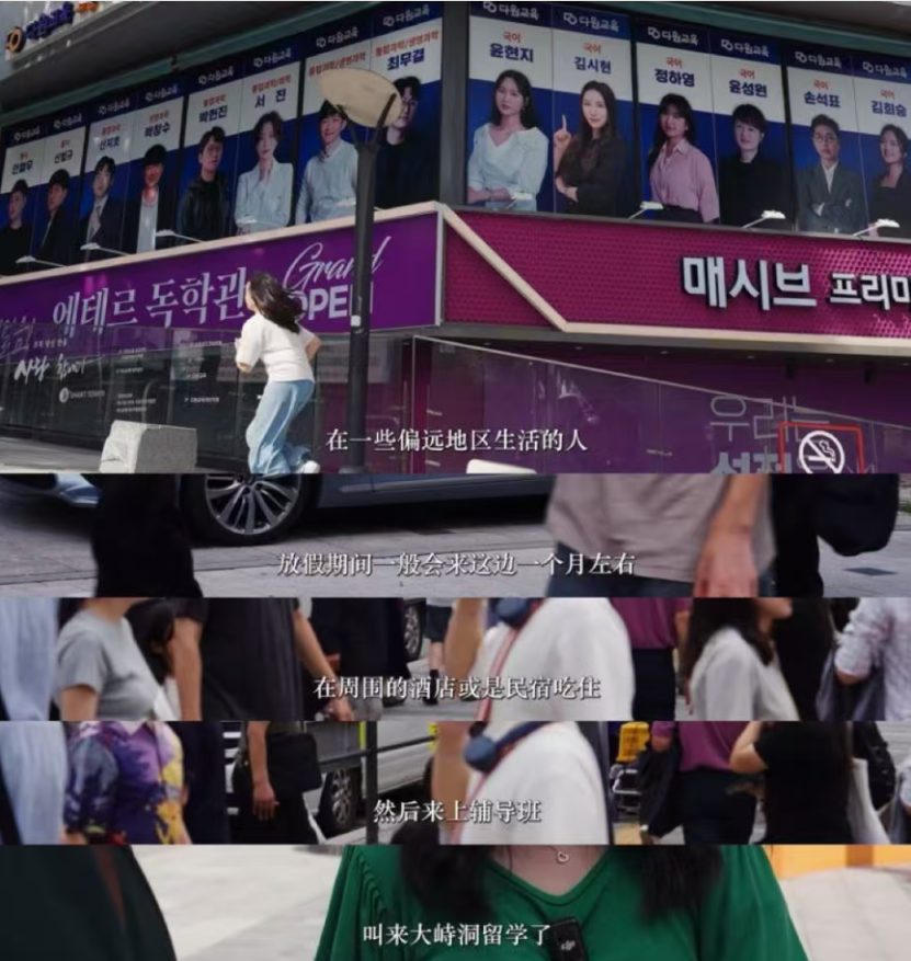 “那是时代人才,很著名的学院。”纪录片中,在补习班中教授汉语的老师金恩智,指着街边一处建筑介绍着。在这所补习学院中,学生可以根据自己的薄弱环节有针对性地进行专科补习,也可以直接选择全科,“这一栋楼就是一条人生啊”。