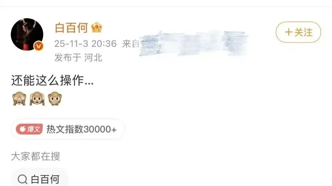 事情的发酵,是从电影《春树》女主角白百何的一条微博开始的。11月3日晚上,白百何发了这么一条微博:“还能这么操作…”配上小猴子捂眼、捂耳、捂嘴的表情三连。就是这么简单的一句话,在网上立刻炸开了锅,因为白百何刚刚还在电影节上参加了影片的放映活动,在东京逗留了好几天,应该是要等待最后的奖项归属,于是这句话就被网友看作是在释放与此有关的信号,似乎是在表达对某种内幕操作的不满。