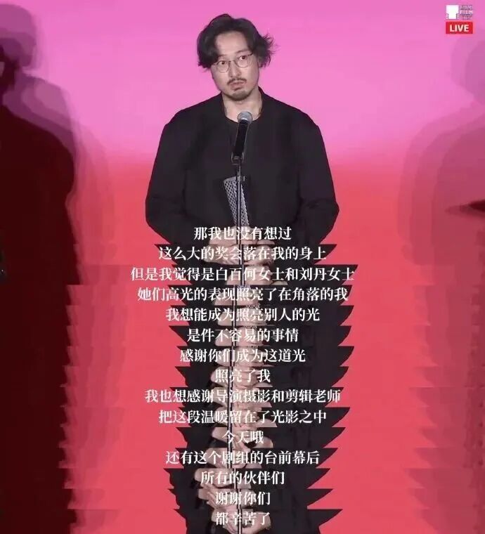 王传君领奖的时候应该已经知道舆论风向,显得面色凝重,他在获奖感言中表示:“我是一个配得感很低的人,我喜欢躲在团队的角落,我也不喜欢说很多话,成为焦点这件事会让我感到恐惧和压力。”紧接着他还着重感谢了电影里的两位女演员,“我觉得是白百何女士和刘丹女士她们高光的表现,照亮了在角落的我。能成为照亮别人的光是不容易的事情,感谢你们照亮了我。”