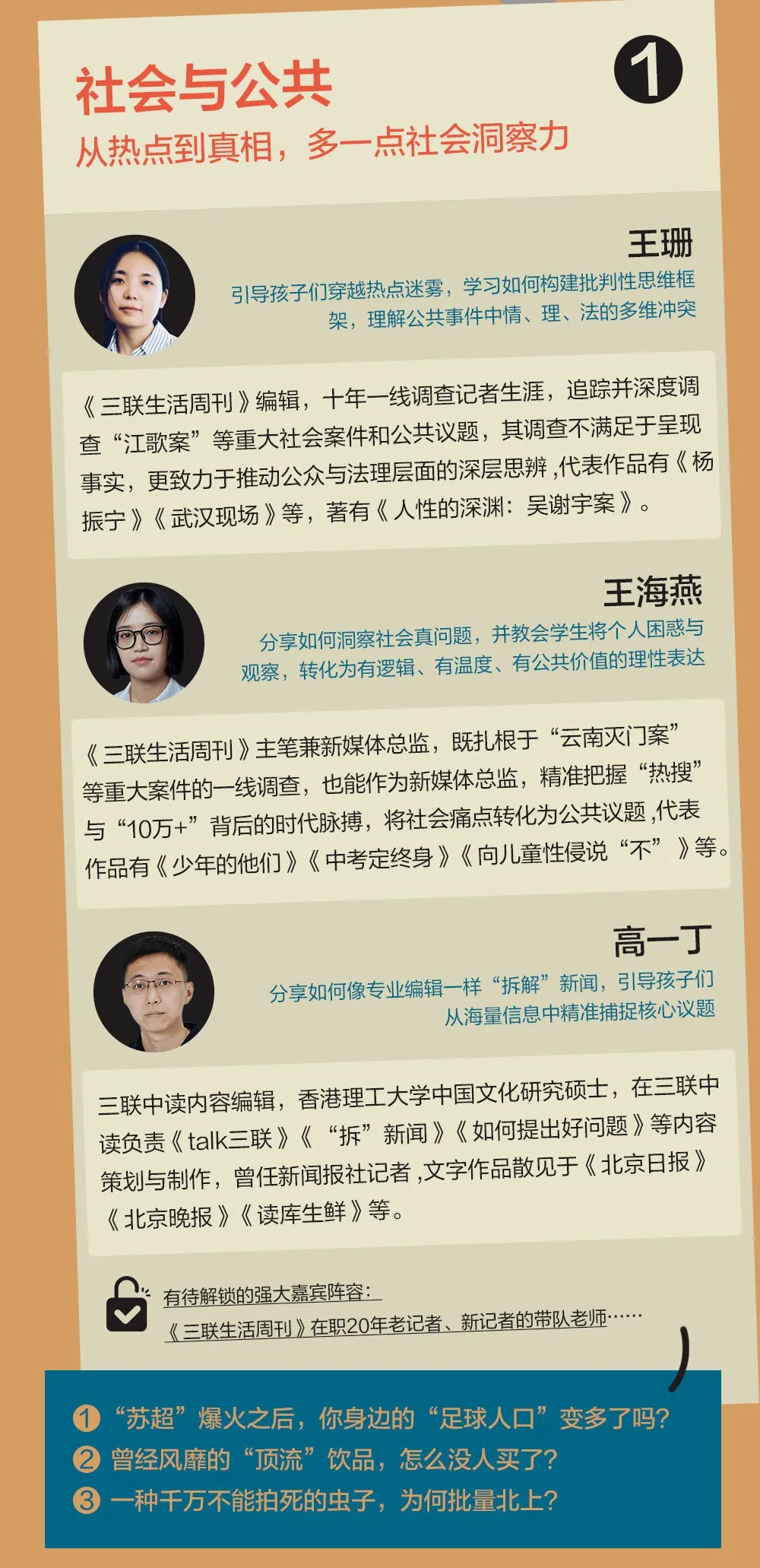 在“社会与公共”板块,我们将围绕《三联生活周刊》多年来秉持的深度调查与人文关怀,选取与青少年成长息息相关的公共议题。从民生百态到制度运行,从伦理思辨到国际视野,我们希望通过真实的人物故事与社会现场,帮助年轻一代建立起对公共生活的理解与责任感。这一板块的常驻嘉宾之一是《三联生活周刊》编辑王珊,她曾深入报道“吴谢宇案”“江歌案”等引发广泛社会思考的案件;同时还有新媒体总监王海燕,她常年身处新闻传播一线,对“热搜”背后的社会心态与传播逻辑有着敏锐洞察。