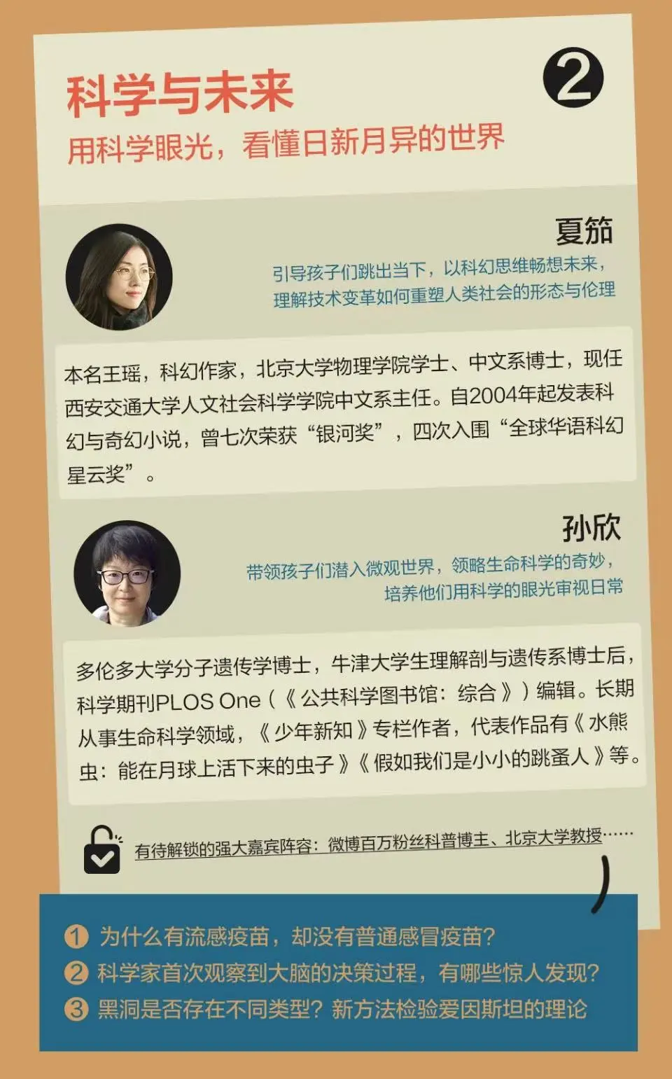 “科技与未来”板块,致力于在科学突破与人文思考之间搭建桥梁。我们不仅关注技术的前沿,更在意科技如何塑造人的处境与未来。这里既有硬核的科学知识,也有对技术伦理的深度反思。我们邀请了牛津大学博士后孙欣;另外一位常驻嘉宾是身兼科幻作家与学者身份的夏笳,她将以独特的跨界视角,带领孩子们展开对未来世界的想象与思辨。
