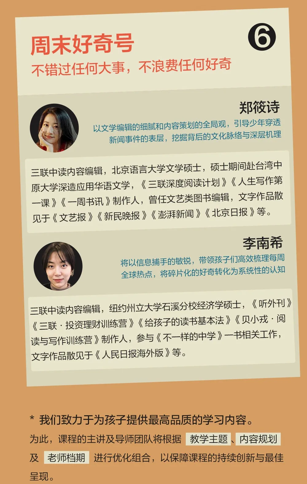 “财经与商业”板块,将从孩子熟悉的日常消费与职业现象入手,逐步展开对经济逻辑与社会结构的认知。我们注重培养理性的财富观念与判断力,也希望传递三联一贯的人文经济视角——经济不仅是数字,更是人的生活与选择。常驻嘉宾之一包括《三联生活周刊》经济类资深主笔邢海洋。以及资深投资人周玖洲,他将从经济学与社会学的双重视角解读商业世界的运行逻辑。
