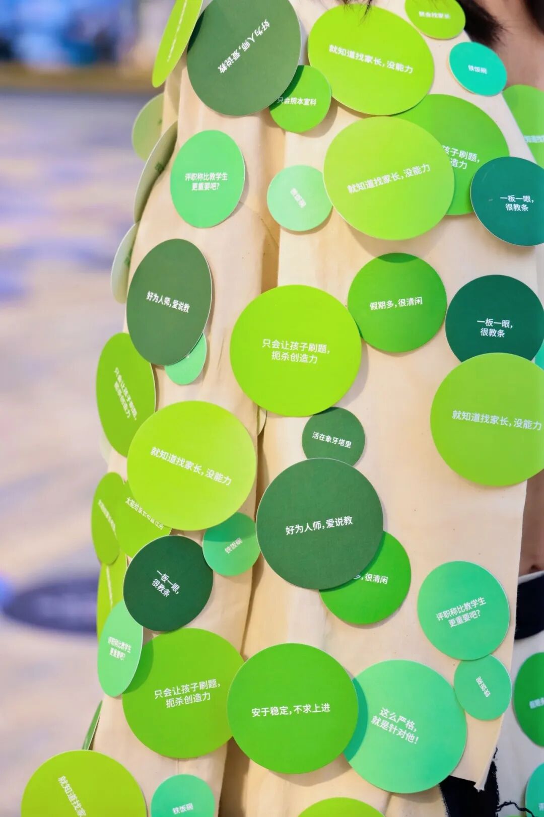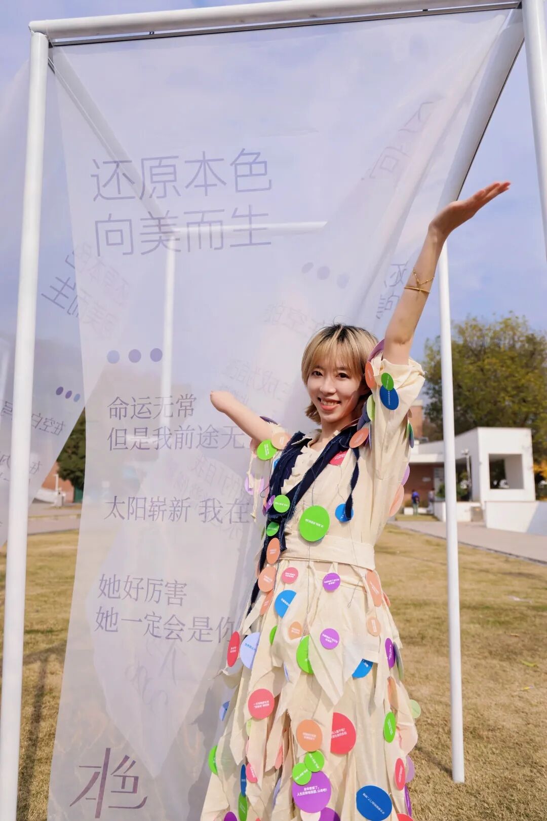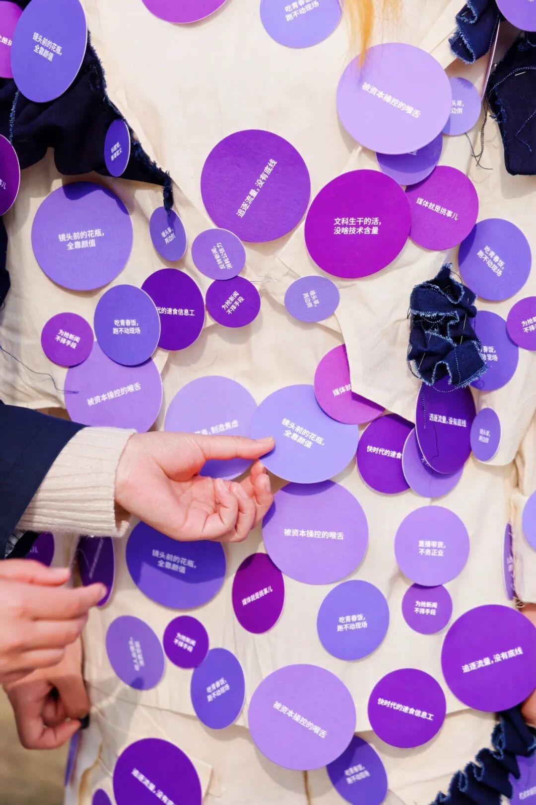 方寸心心站在那里,神情松弛,偶尔和路人聊几句,邀请人们撕掉她身上不认同的标签。上面的字句,是她从自己的评论区里一条条摘出来的。正面是评论区对于残疾人的偏见,而背面则是她自己亲手写下的回应。