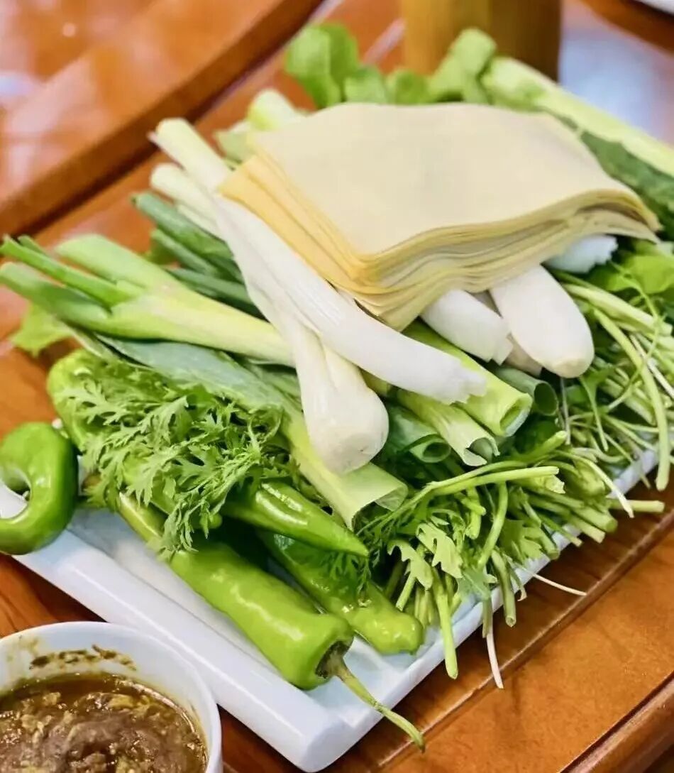离它不远的粗粮人家东北菜馆,一份东北蘸酱菜24元,描述是“干豆腐、黄瓜、小葱、水萝卜、青萝卜、生菜”,以及 “今天生菜没有,改苦苣”。搭配增强滋味的酱料是“鸡蛋酱”。当然,如果你不要鸡蛋酱里额外的油脂,也可以备注“只要大酱”。人工智能计算后告诉我,600克左右的总分量,卡路里大概会在240~270大卡,其中蛋白质18~21克,脂肪8克左右,碳水18~23克。