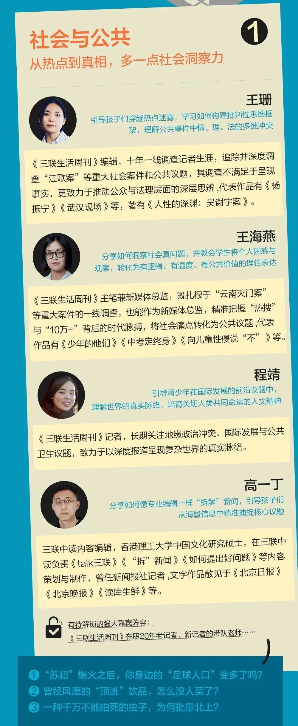 2026三联少年新闻思辨课》的主讲团队,有《三联生活周刊》记者、资深编辑,高校教授,知名作家,资深投资人,著名学者,三联中读编辑团队……这样的阵容,集结在一起,实在罕见!