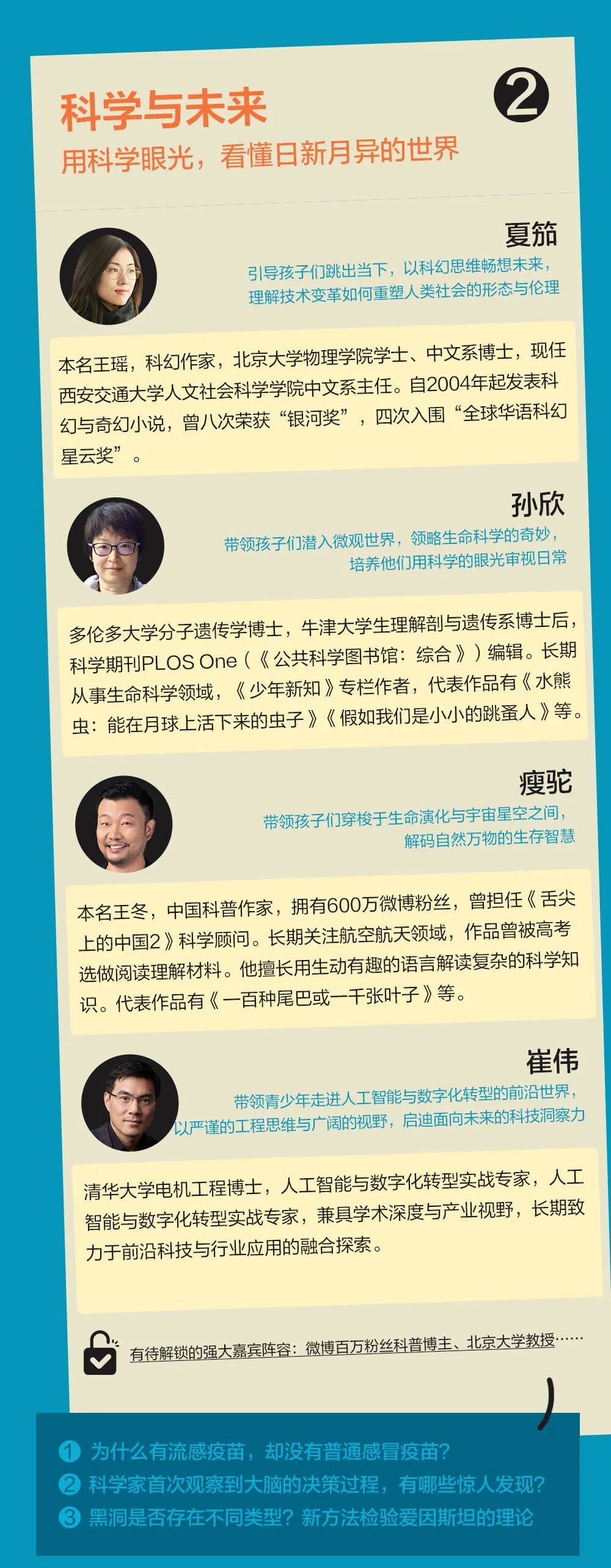 我们邀请了牛津大学博士后孙欣另外一位常驻嘉宾是身兼科幻作家与学者身份的夏笳,她将以独特的跨界视角,带领孩子们展开对未来世界的想象与思辨。