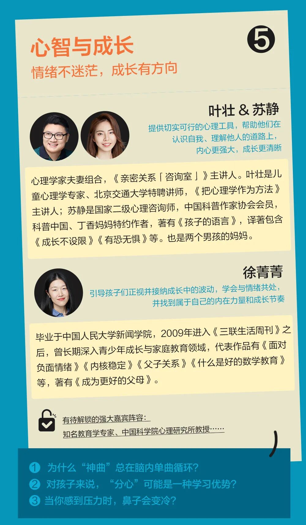 这一部分的常驻嘉宾之一是《三联生活周刊》资深主笔徐菁菁,她长期关注国际新闻与医疗健康领域;同时还有心理学家夫妻组合叶壮与苏静他们都是专业的心理咨询师,将从专业视角与生活经验出发,陪伴孩子走过情绪起伏与认知发展的关键阶段。