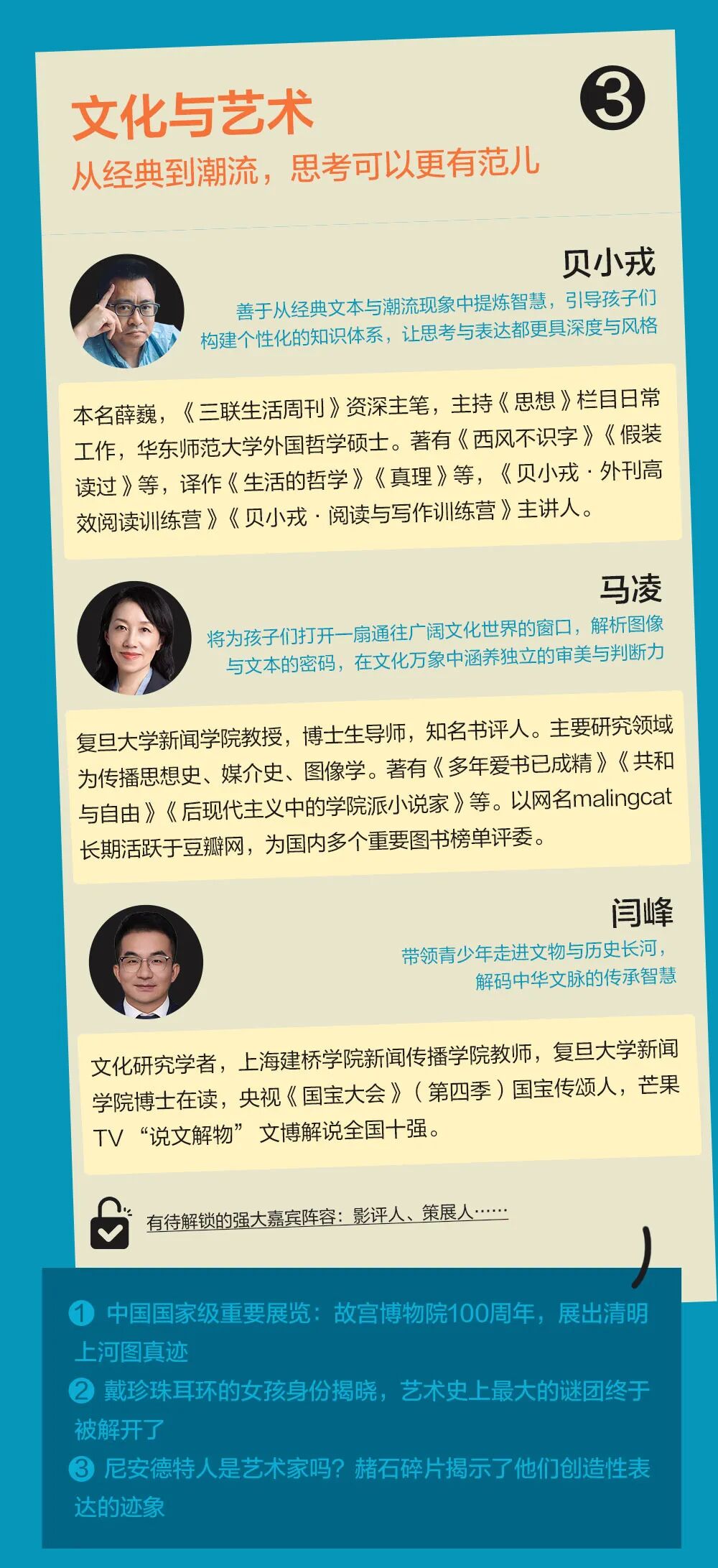 常驻嘉宾之一资深主笔贝小戎,将从哲学与社会学角度切入,训练孩子拆解复杂文化现象;复旦大学教授马凌则以她深厚的学养与鲜明的风格,带领大家读懂艺术与流行背后的时代情绪。