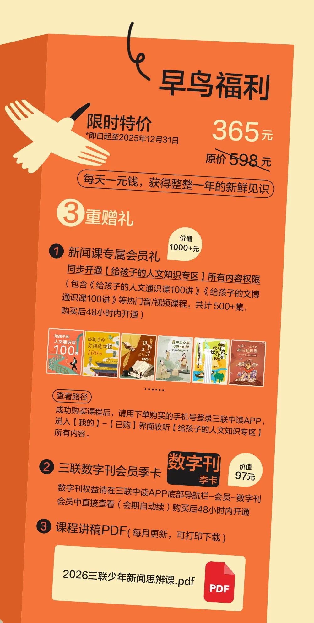 《2026三联少年新闻思辨课》4月已开始起订,欢迎大家带着孩子一起,不错过任何大事,也不放过任何好奇。
