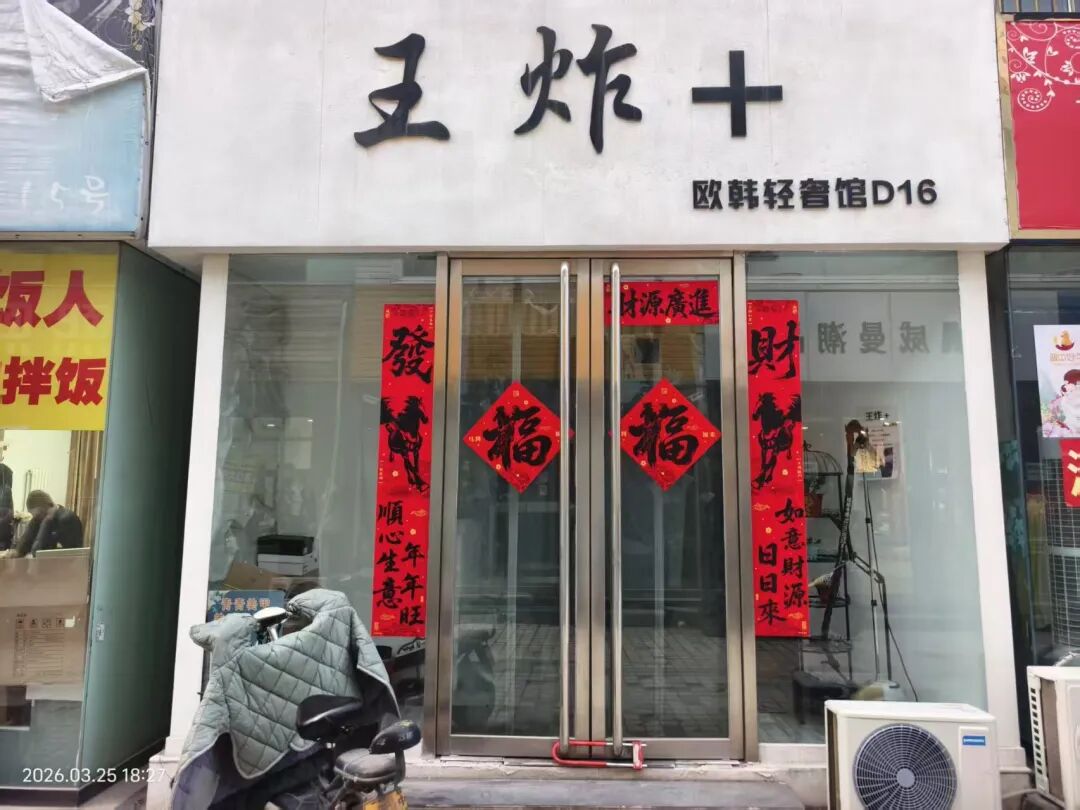 “线上线下一起弄”,两条腿走路,这几乎是新店生存的必须选项。很多店内都摆放着手机支架、环形灯等直播设备,店主多为三四十岁的女性,她们发视频,卖9.9抵39.9的优惠券,直播打广告,为自己的门店引流。王芳的店在步行街靠里租金最便宜的巷道,门口挂着白底黑字“王炸+欧韩轻奢馆”的招牌,如今大门紧闭,底部落着一把红色大锁。门上的新春对联依旧鲜亮,写满了店主对生意的期许,“如意财源日日来,顺心生意年年旺”。透过玻璃门,依稀能看到一个挂满衣服的衣架。