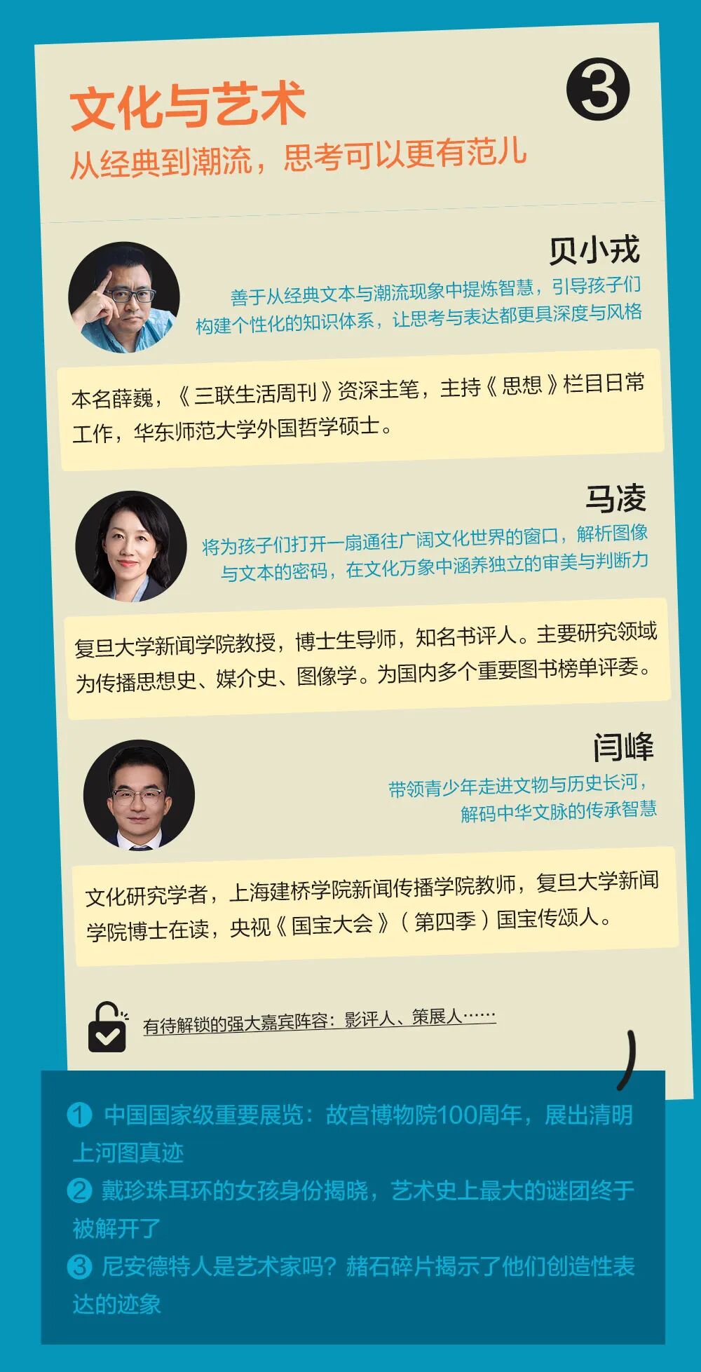 常驻嘉宾之一有资深主笔贝小戎,将从哲学与社会学角度切入,训练孩子拆解复杂文化现象;复旦大学教授马凌则以她深厚的学养与鲜明的风格,带领大家读懂艺术与流行背后的时代情绪。