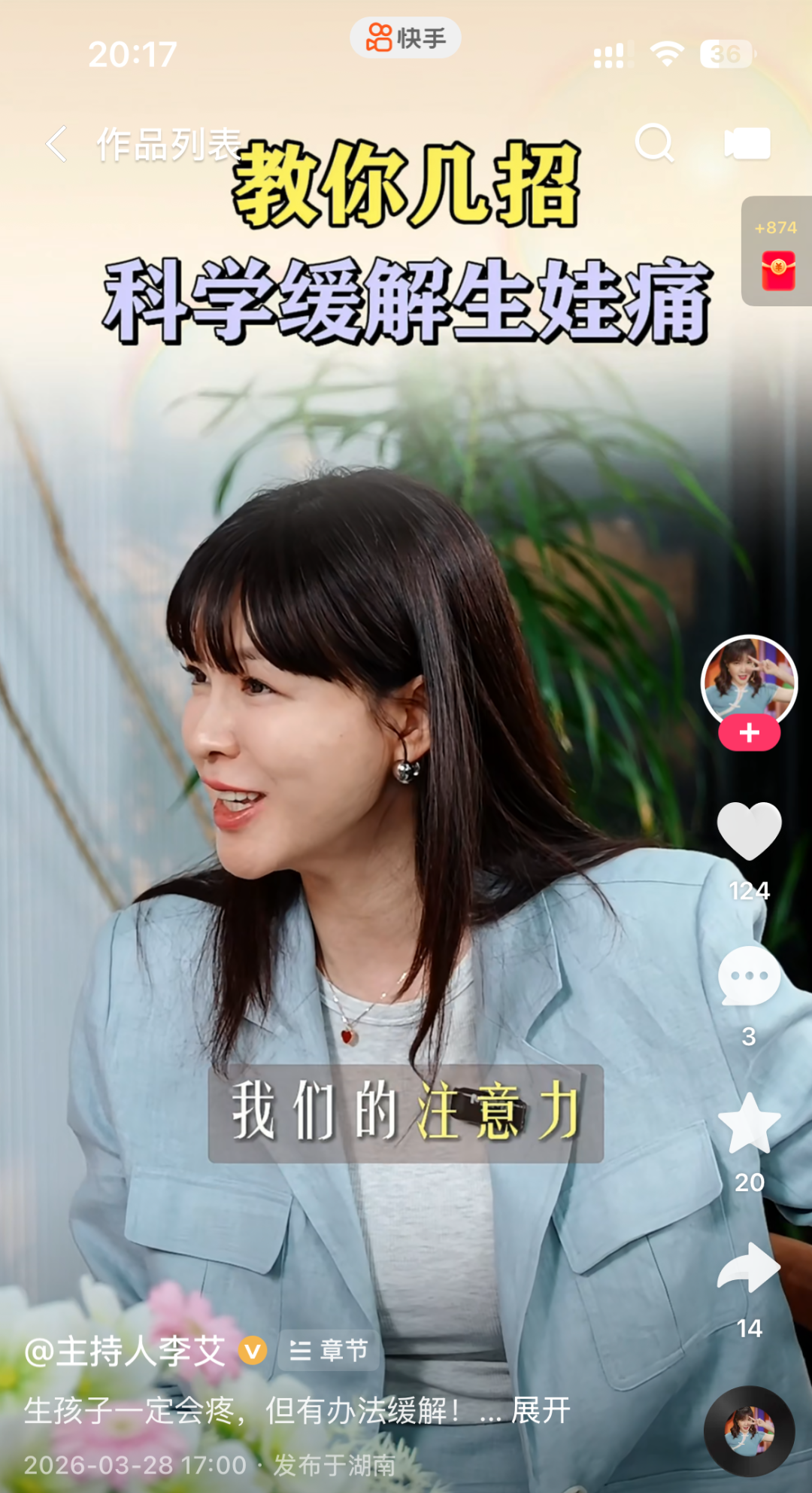 李艾在自己的快手账号上进行了许多有关生育话题的讨论
