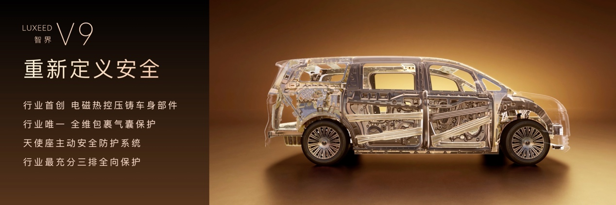 此外,全维包裹安全气囊全方位守护头颈胸等关键部位,带来“金钟罩”般的防护。智界V9采用行业创新电磁热控压铸车身部件,车身强度大幅提升,搭载天使座主动安全防护系统等配置,打造充分三排全向保护,以安全是最大豪华的硬核实力,重塑MPV安全标杆。