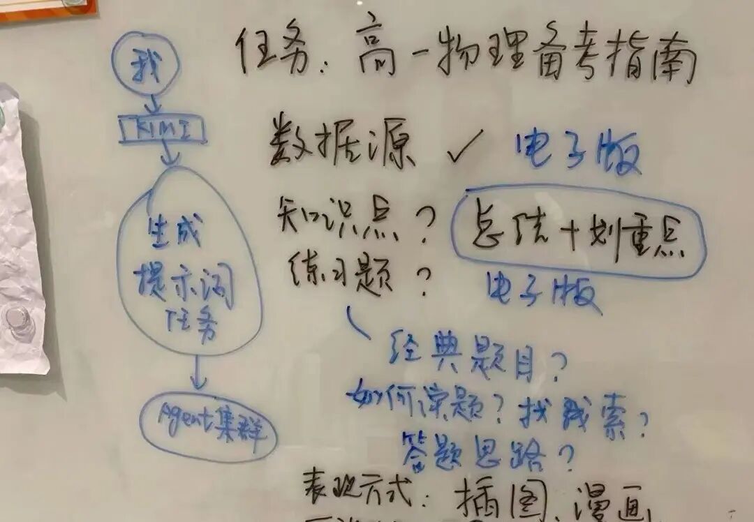 为了在旅行中也能兼顾学习,谦谦和爸爸决定用AI搭一个物理学习网站。寒假的第一个周末,父子俩围在书房的白板前,用马克笔一步步画出网站制作流程。他们把任务拆解成一个个清晰的模块,谦谦和爸爸负责找资料、测试功能,然后把需求丢给Kimi让它帮忙写代码,生成网站。