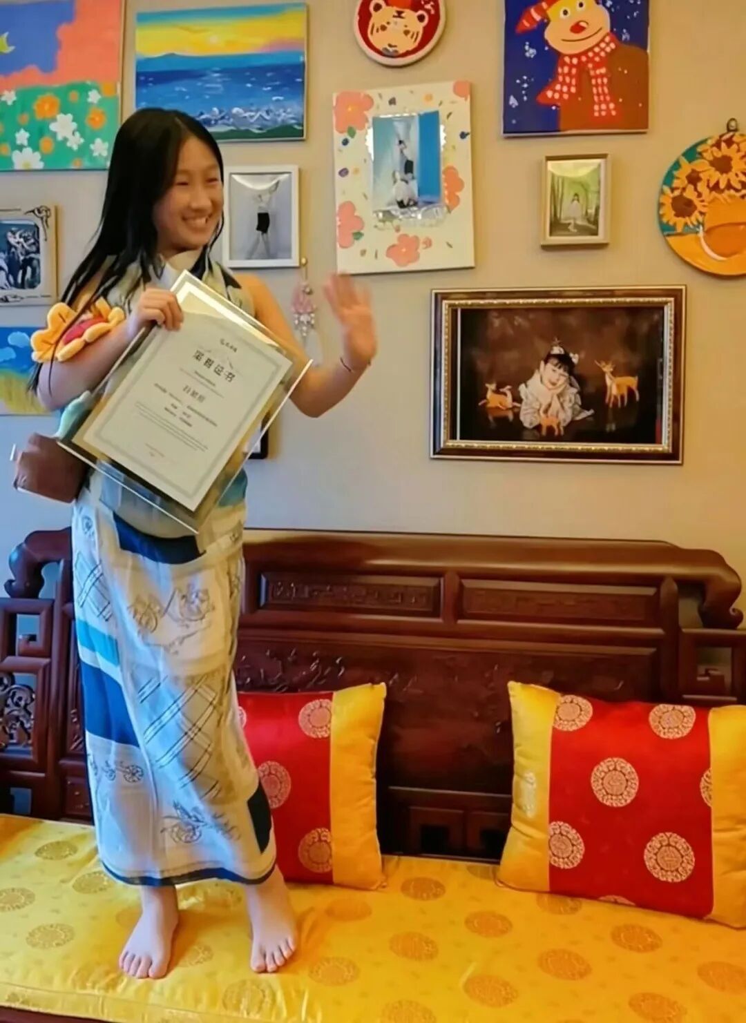 思彤父母在家里为她补办颁奖仪式