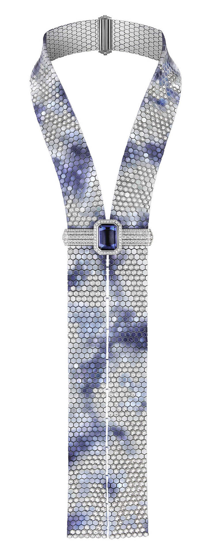 宝诗龙Fenêtre Sur Ciel项链由钛金网织成,上面的珍珠母贝描绘出暴风雨来袭时的天空,大片钻石烘托出云团的效果,一颗35克拉的深蓝色舒格洛夫切割坦桑石镶嵌于项链中央。