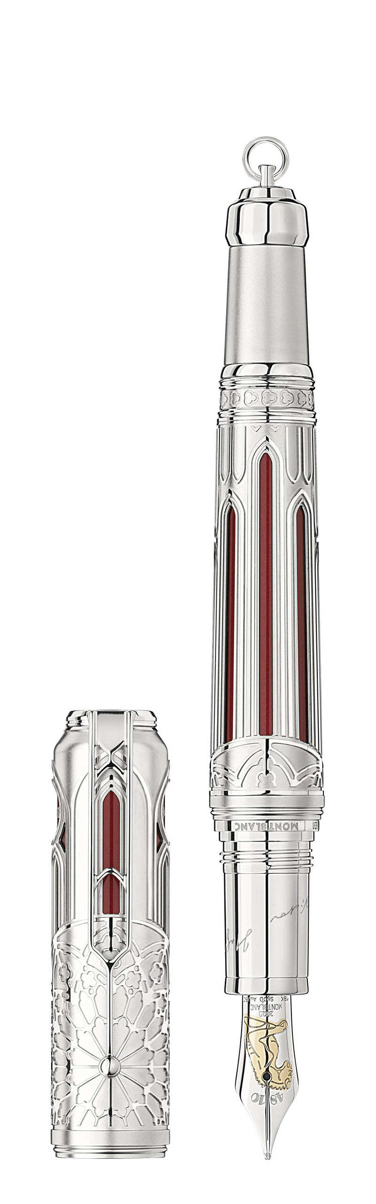 万宝龙大文豪系列致敬维克多·雨果书写工具LE1831采用镀铂金饰红色半透明漆料,笔帽和笔杆重现了巴黎圣母院宏伟建筑的特色,精巧雕饰来源于彩绘玫瑰窗。