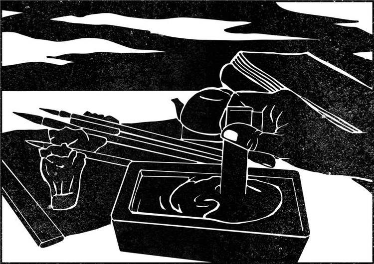 这个男子磨心相见,砚生风月。三岛由纪夫笔下的繁子也写信,她面对夕阳照射的窗口,打开了砚盒。可是,从添水口流下来的水滴,承受着火红的光线,变成了血珠。接着,她打开纸卷,用执拗的指力,恶狠狠地磨着很香的中国墨。