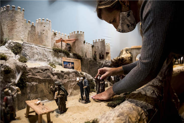 11月19日,韦托塔哈尔镇举行2020年主题纪念活动。图为一名工作人员在调试《耶稣诞生场景》里的雕塑位置,仔细观察,这些雕塑每个都戴着口罩。
