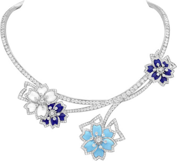 梵克雅宝Hellébore系列珠宝以珍珠贝母、青金石和绿松石打造的浮雕花瓣交织镶嵌在不同层次的白K金底座上,最上层的7颗花蕊令花朵更显灵动,花瓣边缘的钻石犹如覆盖着的雪花。