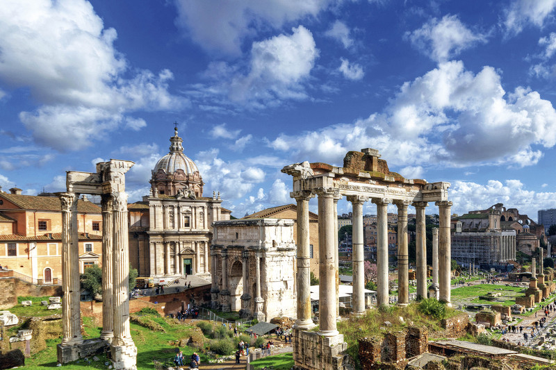 人们常说“罗马立于七座山丘之上”,Forum Romanum的废墟正在两座这样的山丘之间,鼎鼎有名,上面曾经簇集了共和国和帝国时期陆续建起来的数十座重要的建筑物。中文语境里偶把Forum翻译为“论坛”,实在不足以表达此地的显赫,也不利于向今天的旅游者解释它的意义。此“坛”既不是非常规整的形状,也没有明确的边界或者统一的内部轴线,它既是类似于华盛顿的中央草坪那样的长条开放空间,一路延向卡匹托里尼(Capitoline)山丘上的神庙,也是沿着帕拉蒂尼(Palatine)山丘北缘次第建起的建筑物的总称。