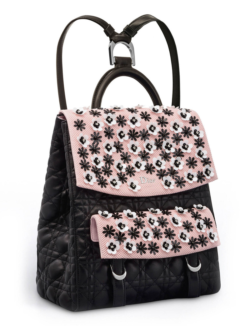 Dior“星尘”系列双肩背包以针迹明缝的黑色小羊皮制作,粉色羊皮包盖上点缀亮片刺绣的花朵,传递出随意的街头风格。