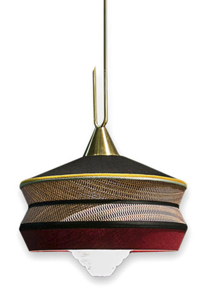 意大利品牌Con-tardi的Calypso吊灯,编织丝线覆盖的灯罩搭配黄铜顶盖和吊环,鲜艳的色彩和图案显示出南美风格的影响。