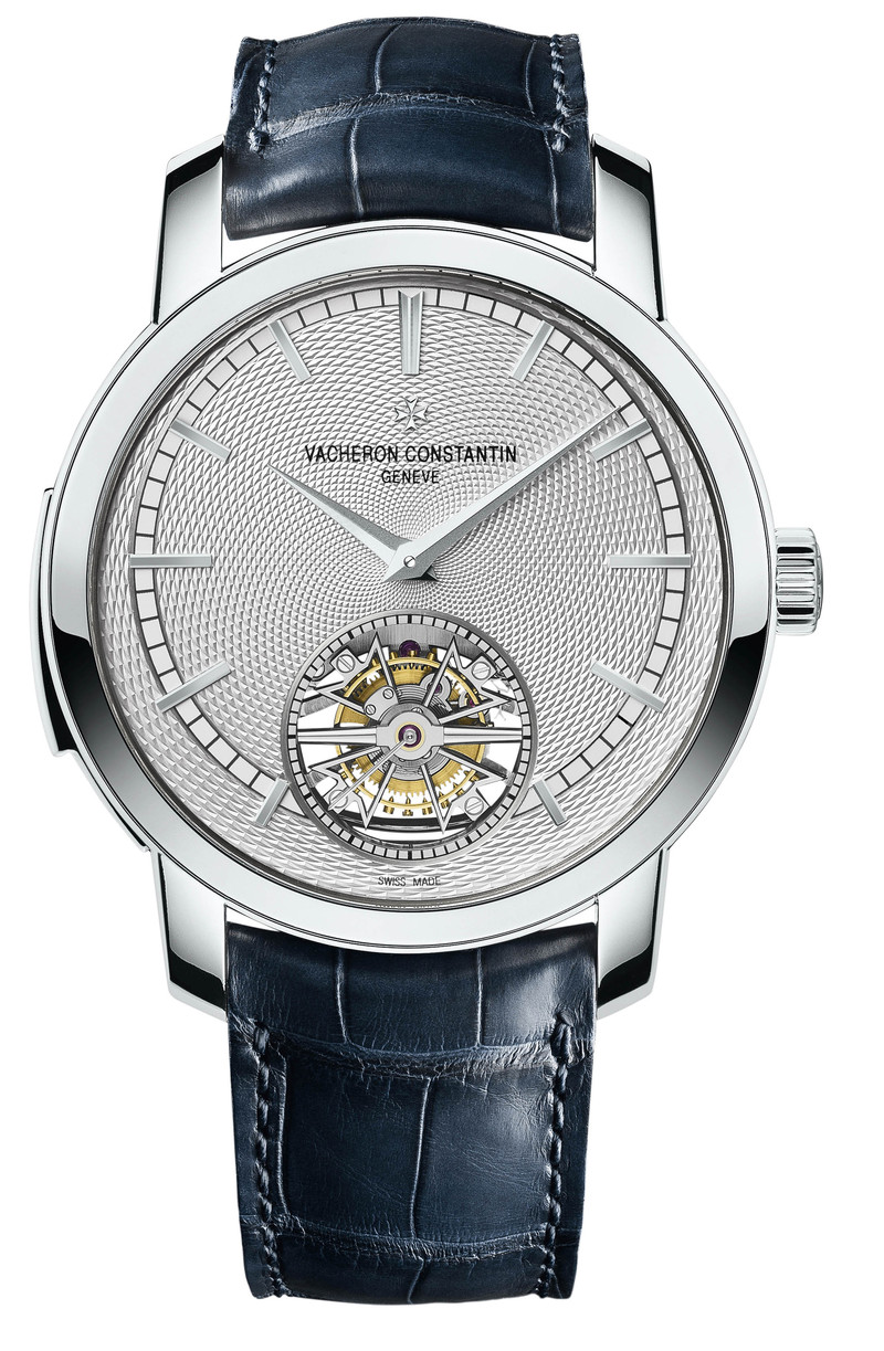 江诗丹顿Traditionnelle传袭系列陀飞轮三问表具有三问报时功能,乳白色表盘装饰手工机刻雕花图案,马耳他十字造型框架的陀飞轮装置位于6点钟位置。