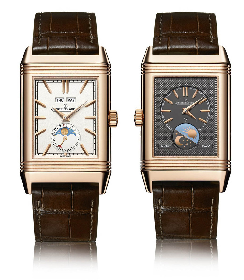 有85年历史的积家Reverso翻转设计延续了Art Deco风格,在日历翻转系列腕表中配备了全历显示功能,两个面盘显示了不同时区的时间。正面有月相与日期显示,背面表盘的灰色扭索饰纹采用了“巴黎铆钉”饰纹。