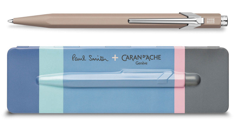 Caran d'Ache和Paul Smith合作的849系列圆珠笔,六角形铝质笔身上分别运用保罗·史密斯“艺术家条纹”中的8种色彩,超薄笔盒上同样印有这一标志性条纹。 )
