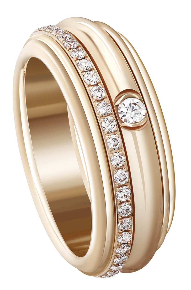 伯爵Possession系列玫瑰金戒指由两个不对称的圆环构成,较宽的圆环上点缀单颗钻石,较细的圆环上镶嵌了一圈明亮型切割钻石,而且可以自由转动。