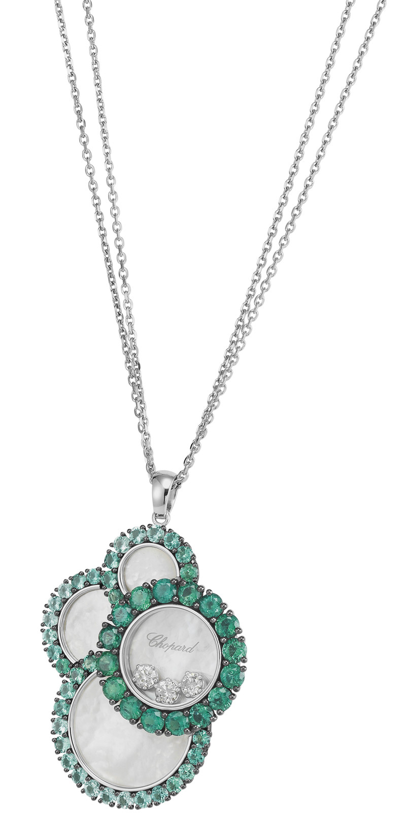 在充满欢欣气息的萧邦Happy Diamonds系列新品珠宝中,旋动钻石体积更大,且采用了不同的切割形状。祖母绿宝石镶出的云朵造型增加了梦幻感。