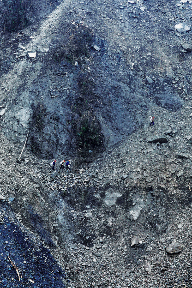 ( 震后通往映秀的4条道路完全被毁,逃生的人们在滑落的山石中顽强前行
