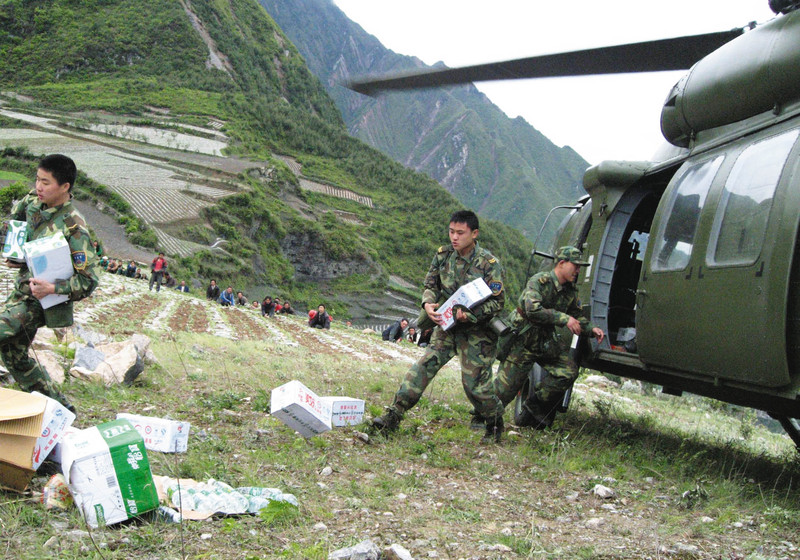 ( 5月14日,乘坐直升机抵达汶川的解放军送来救援物资