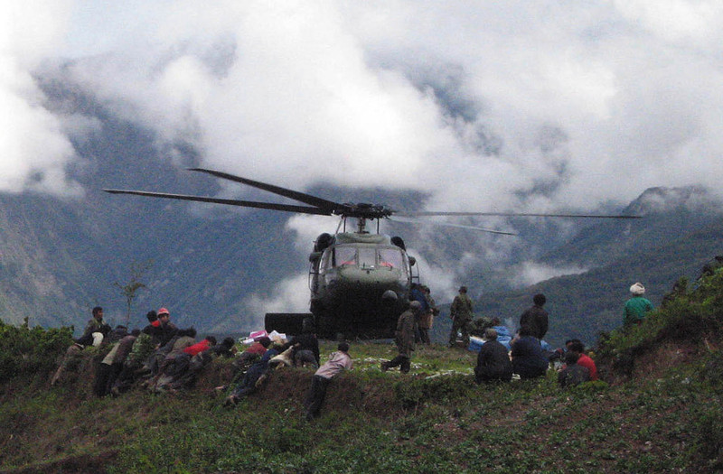 ( 5月14日,直升机携带着救援物资抵达汶川县城附近的山顶