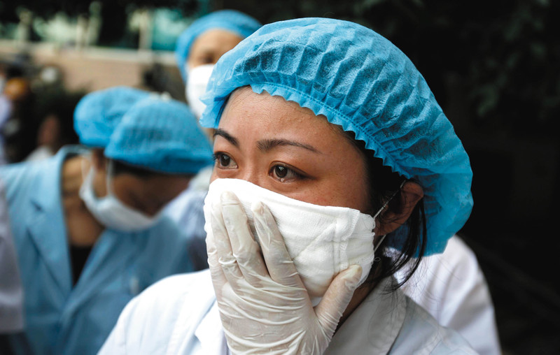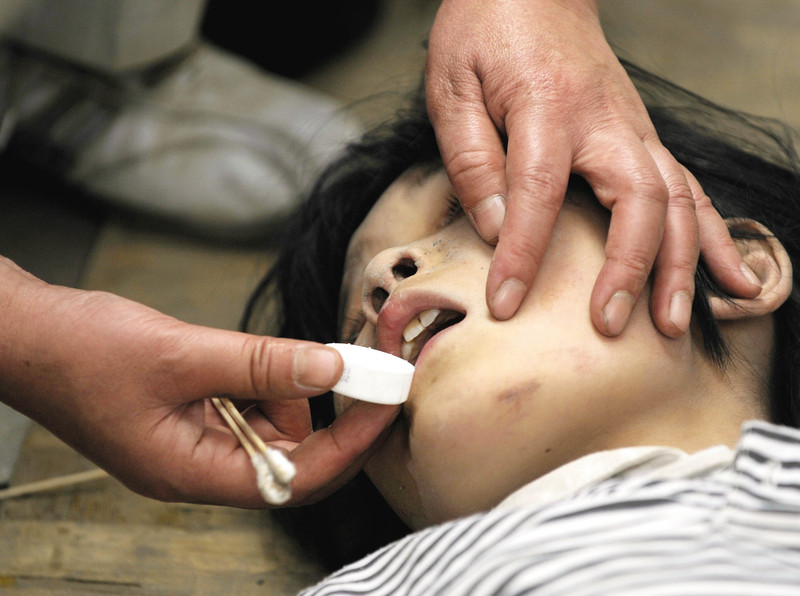 ( 5月15日,一名11岁女孩刚从映秀县某学校废墟中被救出,医生当场实施救助