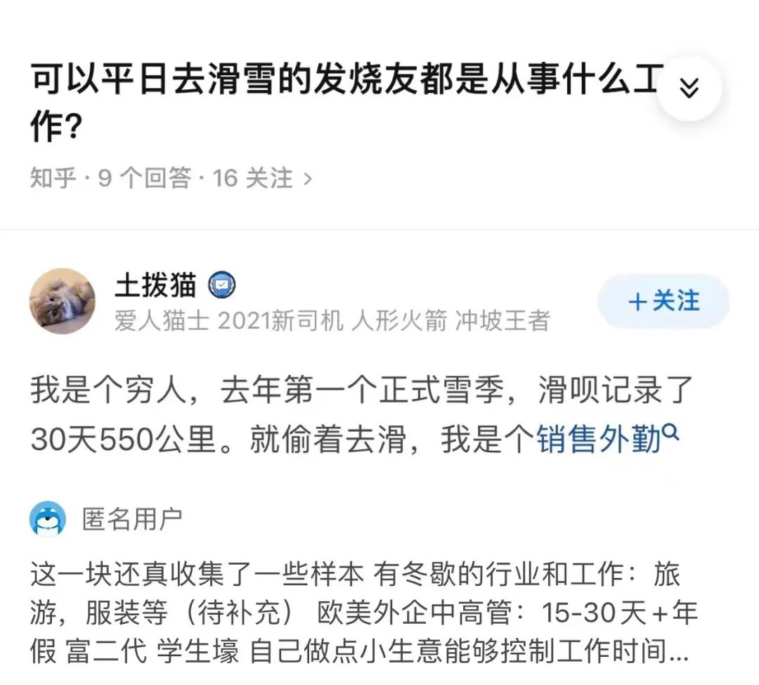 大菠萝属于后者,朝九晚五,双城奔波。“工作日疯狂加班,周五下班开车去雪场,元旦那次为了玩个痛快,我连续加了4天班。”在大菠萝看来,能每周跨城滑雪的都是狠人,“不管工作日多苦多累,一到雪场,立马亢奋,满脑子都是冲冲冲。”