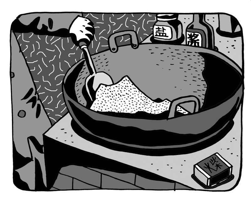 外公极擅长烧镬焦。他曾说过,烧镬焦必须掌握两大要领。一是控制火候。太旺了镬焦易变成焦黑,不够旺又结不了底,这在那时普遍使用的大镬灶里着实不易把握好。二是处理镬底。当时有人用铝皮依镬底打一张垫子,再在垫子周身戳满细细小小的眼子,紧紧地贴置于镬底,这样火稍旺点也不易过焦,还容易提取。不过外公从未使用过这种镬垫,他主要利用油来润滑镬底。每年入冬之后,外婆会炸些猪油,一碗一碗地冷凝起来。外公在大家米饭盛得差不多的时候,将黏附于镬焦上的米粒一一刮干净,再撬起一调羹冻猪油,均匀地涂抹在整锅镬焦上面,然后盖紧镬盖,往灶膛内烧一小蓬柴,待冻猪油完全融化,渗透整张镬焦,便用镬铲小心翼翼地铲起来,活脱脱一顶绍兴乌毡帽。没有冻猪油的季节里,外公就用菜籽油代替,或者炒完要起过油锅的菜之后再煮饭,这样烧起的镬焦就会显得金黄、油脆。年成好的日子里,外婆会叫外公往镬焦里面撒上些白糖、芝麻,再紧紧地捏成团。我们那一张张馋嘴轻轻地凑上去咬一口,蜜甜,酥香,人生简直夫复何求!
