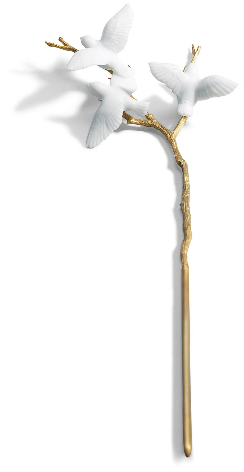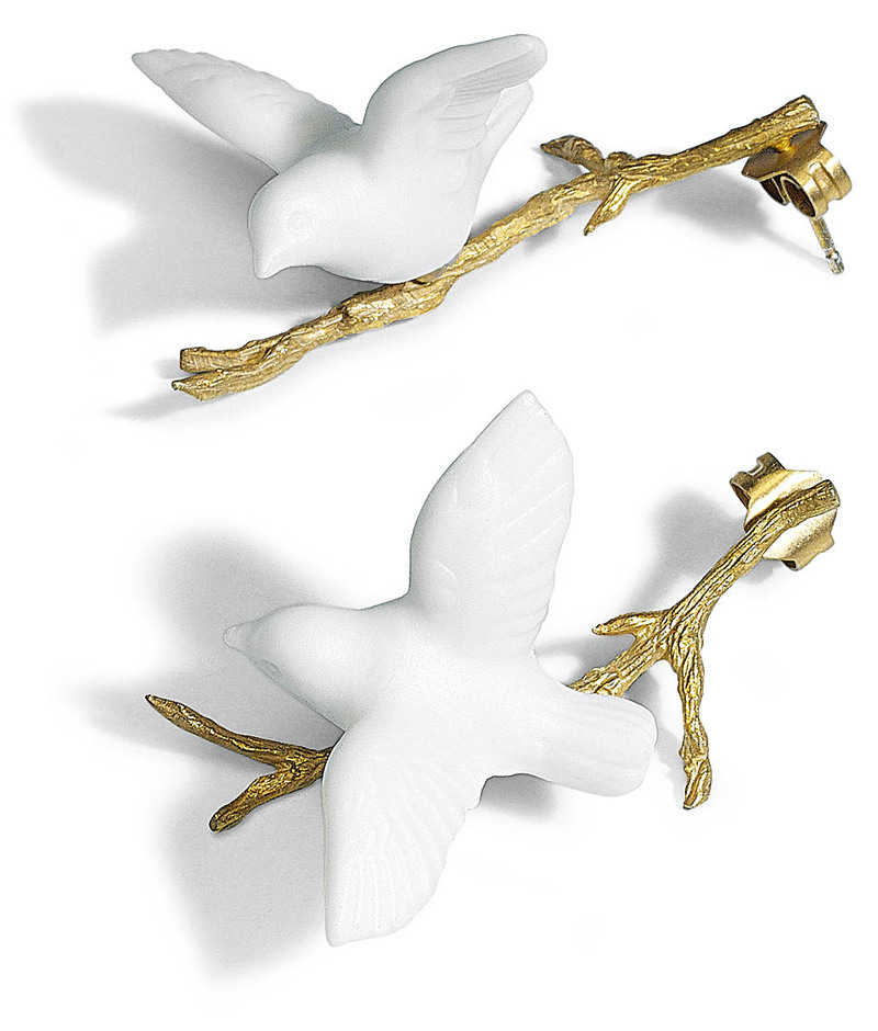雅致“魔幻森林”系列中的耳坠、发簪等配饰,18K镀金底座上停栖着几只雾彩的陶瓷小鸟,好像随时会展翅飞走,陶瓷的柔白与金属的粗硬质感形成对比。整个系列由德国设计师伯多·斯佩林(Bodo Sperlein)设计,给予传统的陶瓷饰品一种清新的当代风格。■ )