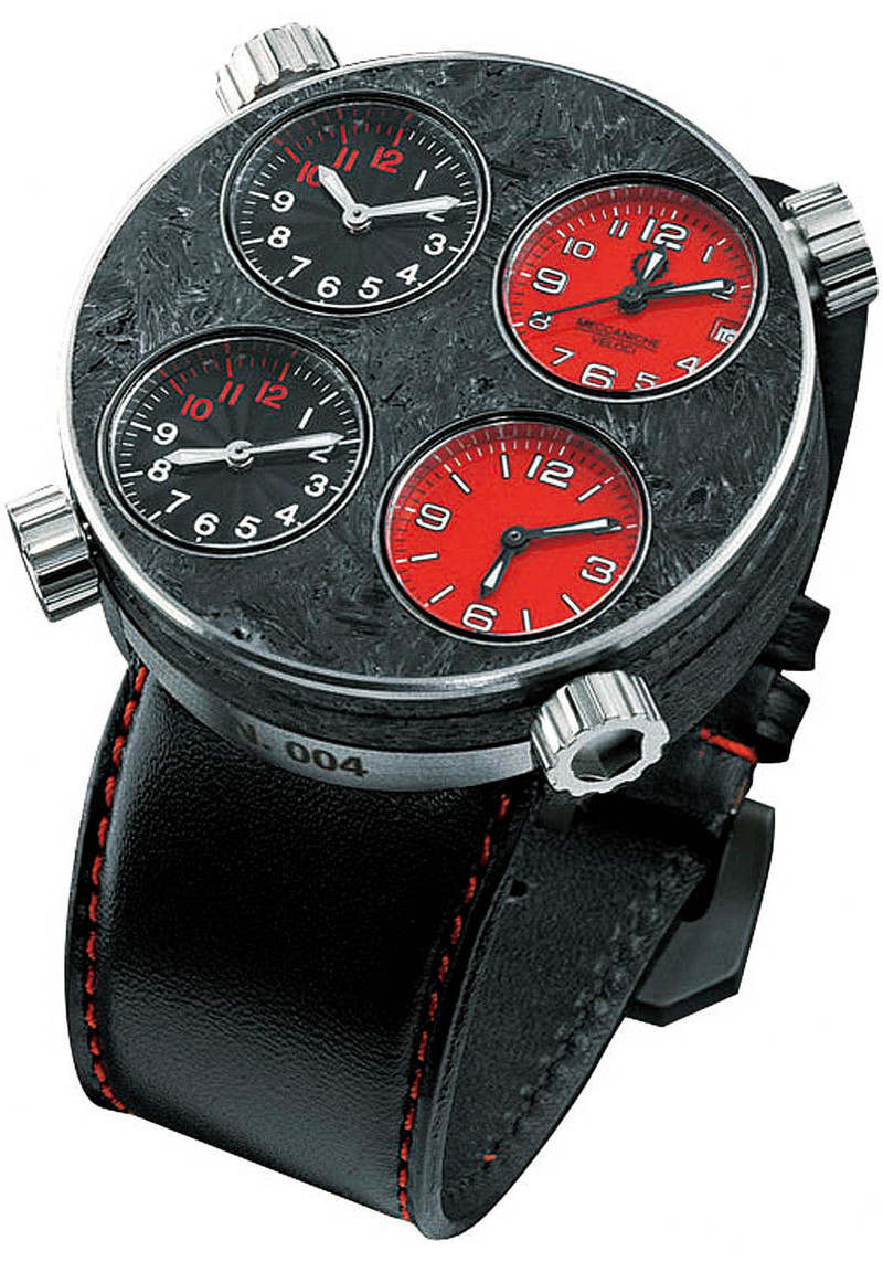 作为欧洲陶瓷装甲和碳纤维刹车片制造商,Brembo拥有独特的碳纤维陶瓷复合材料配方,可以在保持坚固和轻量化的平衡之外,更突出滑润的质感。Meccaniche Veloci在设计Quattro Valvole腕表时充分挖掘这种特别的质感,4个独立的计时表盘可以由4个角度的旋钮单独控制。■ )