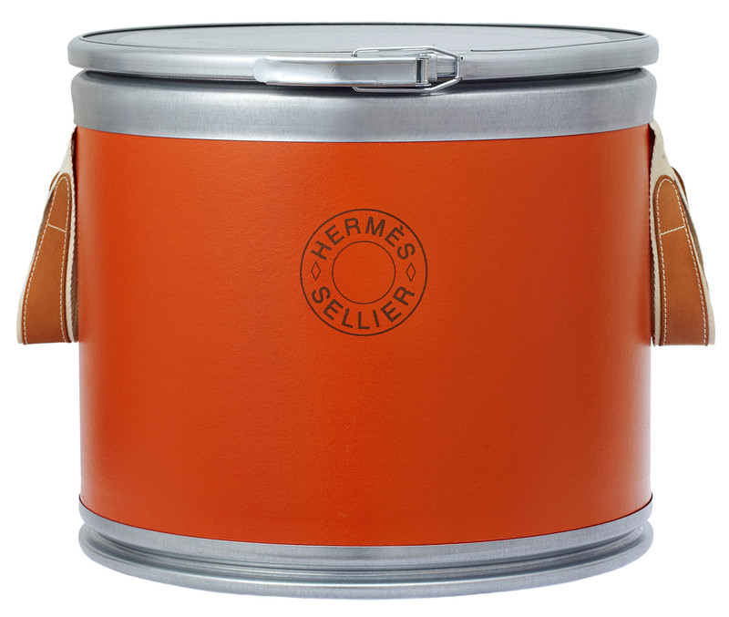 这款爱马仕储存箱用来存放刷洗马匹的工具,像绷带、刷子、肥皂、马笼头等。储存箱结合了橙色厚纸板和金属两种材质,鞍钉丝网印花和牛皮手柄属于从骑士传统流传下来的标志性符号。■ )
