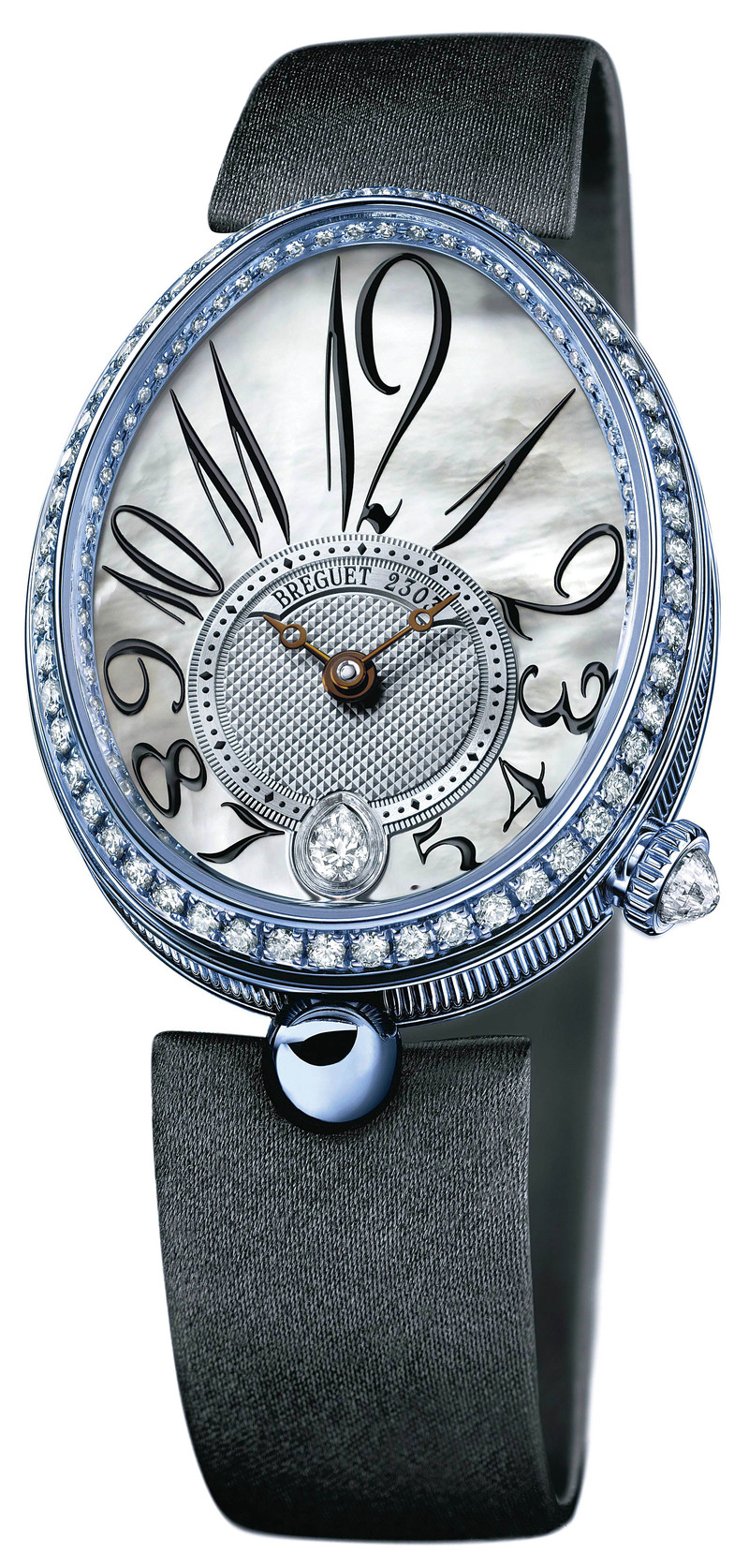 采用柔润鹅蛋形设计的宝玑那不勒斯王后(Reine de Naples)系列腕表,因那不勒斯王后卡罗琳·穆拉特而得名,4点位置的表冠和有特色的表耳是它的标识。这一玫瑰金款式在表圈周围镶117颗完整切割的钻石,18K金镀银表盘采用手工镌刻,6点的位置镶嵌了一颗梨形钻石。■ )